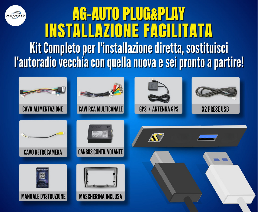 L'installazione avviene con il sistema plug&play AG-AUTO, che assicura un montaggio semplice come la radio originale, anche in autonomia. Tutti i cavi sono separati, etichettati e accompagnati da uno schema che aiuta l'installazione.