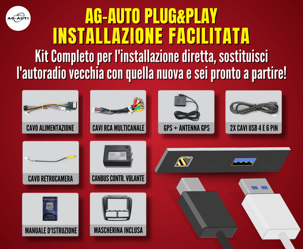 L'installazione avviene con il sistema plug&play AG-AUTO, che assicura un montaggio semplice come la radio originale, anche in autonomia. Tutti i cavi sono separati, etichettati e accompagnati da uno schema che aiuta l'installazione.