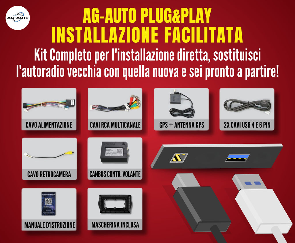 L'installazione avviene con il sistema plug&play AG-AUTO, che assicura un montaggio semplice come la radio originale, anche in autonomia. Tutti i cavi sono separati, etichettati e accompagnati da uno schema che aiuta l'installazione.
