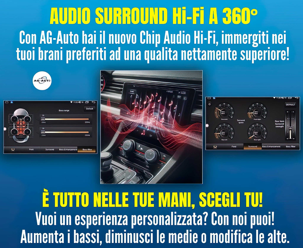 🔊 HiFi AG-Auto: EQ/DSP + amplificatore dedicato per un audio superiore + Uscite RCA con AUX e Subwoofer