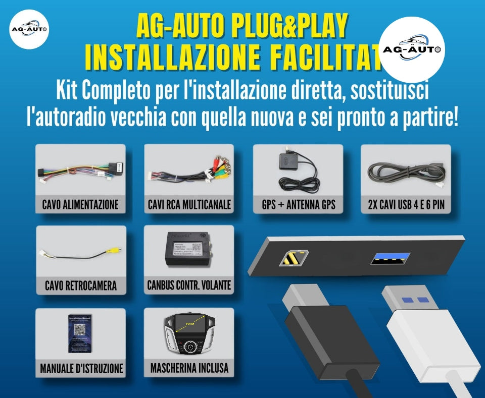 L'installazione avviene con il sistema plug&play AG-AUTO, che assicura un montaggio semplice come la radio originale, anche in autonomia. Tutti i cavi sono separati, etichettati e accompagnati da uno schema che aiuta l'installazione.