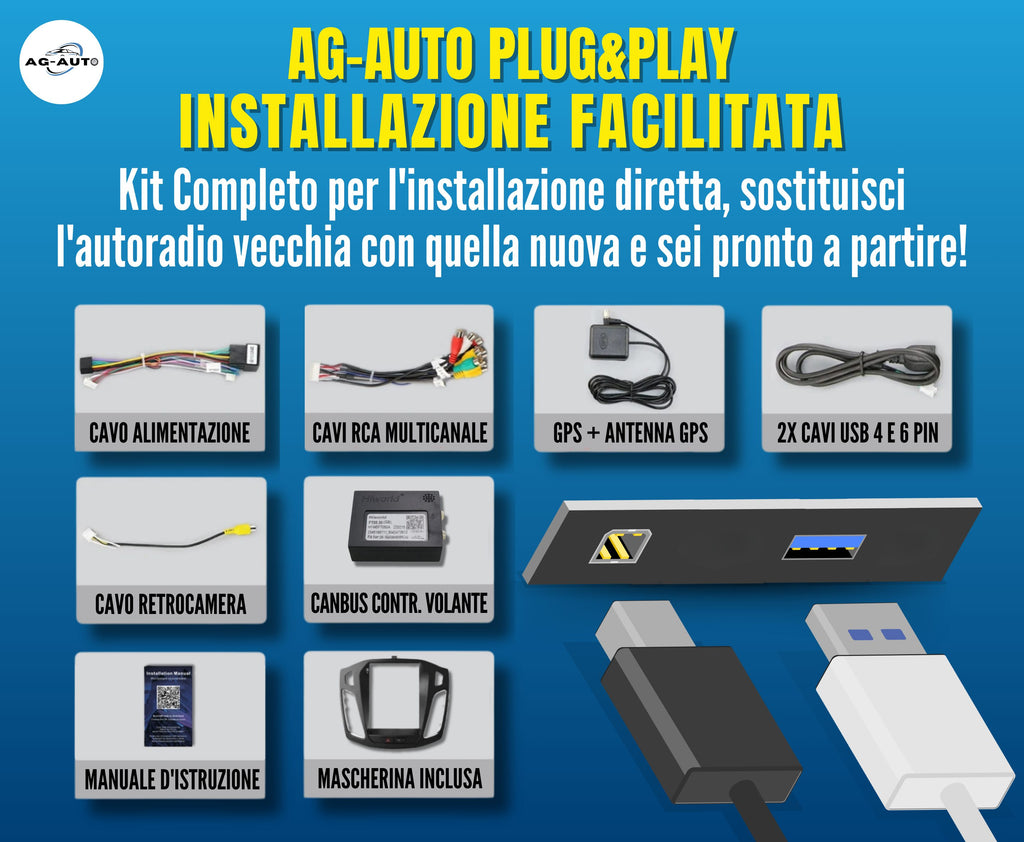 L'installazione avviene con il sistema plug&play AG-AUTO, che assicura un montaggio semplice come la radio originale, anche in autonomia. Tutti i cavi sono separati, etichettati e accompagnati da uno schema che aiuta l'installazione.