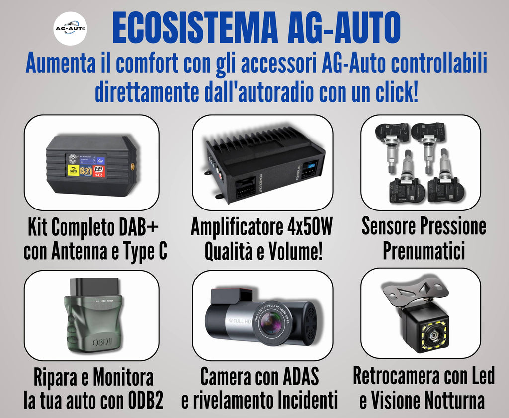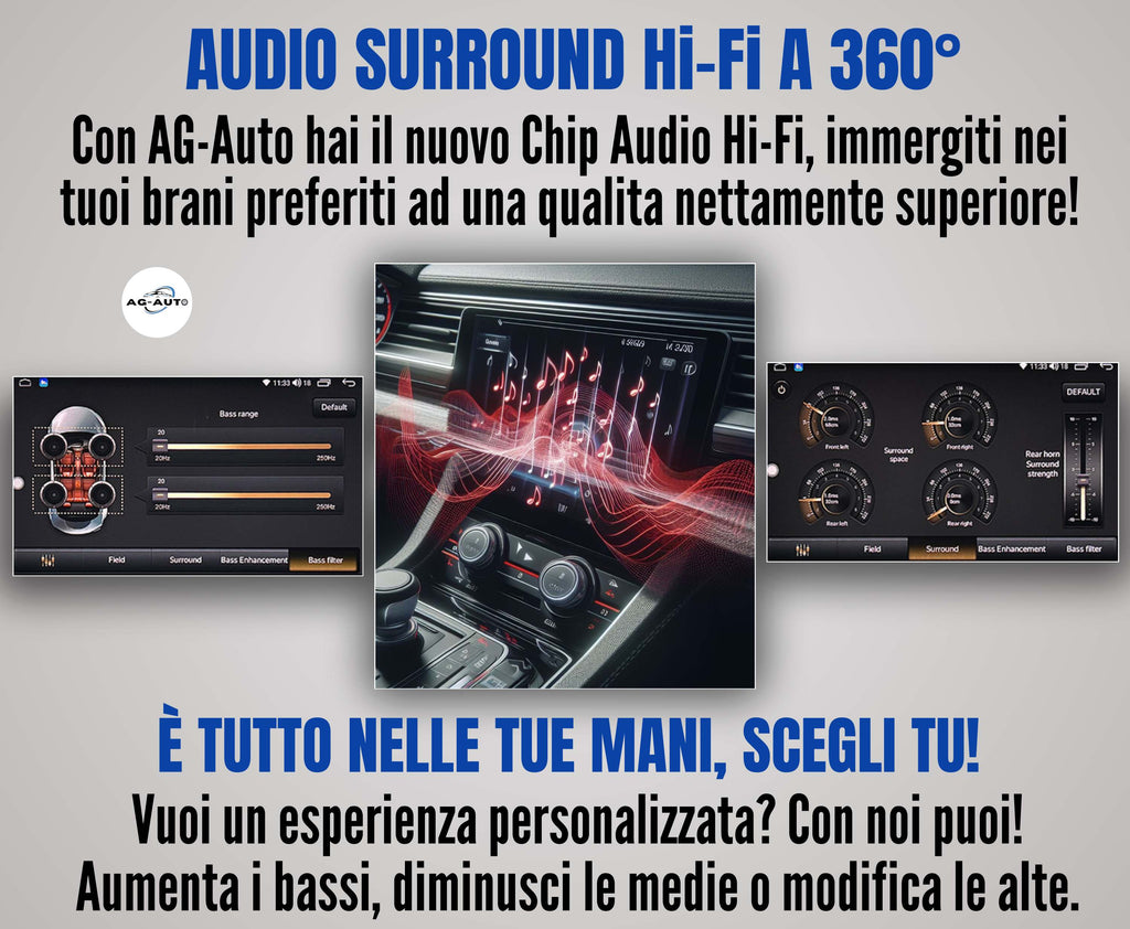 🔊 HiFi AG-Auto: EQ/DSP + amplificatore dedicato per un audio superiore + Uscite RCA con AUX e Subwoofer