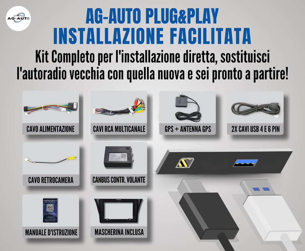 L'installazione avviene con il sistema plug&play AG-AUTO, che assicura un montaggio semplice come la radio originale, anche in autonomia. Tutti i cavi sono separati, etichettati e accompagnati da uno schema che aiuta l'installazione.