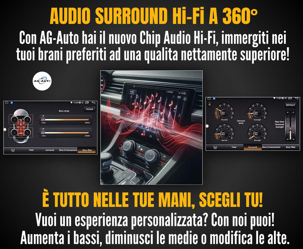 🔊 HiFi AG-Auto: EQ/DSP + amplificatore dedicato per un audio superiore + Uscite RCA con AUX e Subwoofer