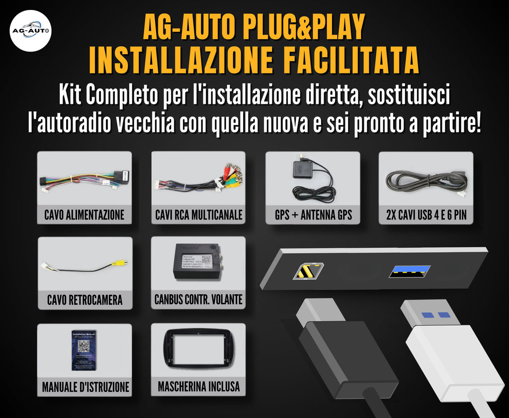 L'installazione avviene con il sistema plug&play AG-AUTO, che assicura un montaggio semplice come la radio originale, anche in autonomia. Tutti i cavi sono separati, etichettati e accompagnati da uno schema che aiuta l'installazione.
