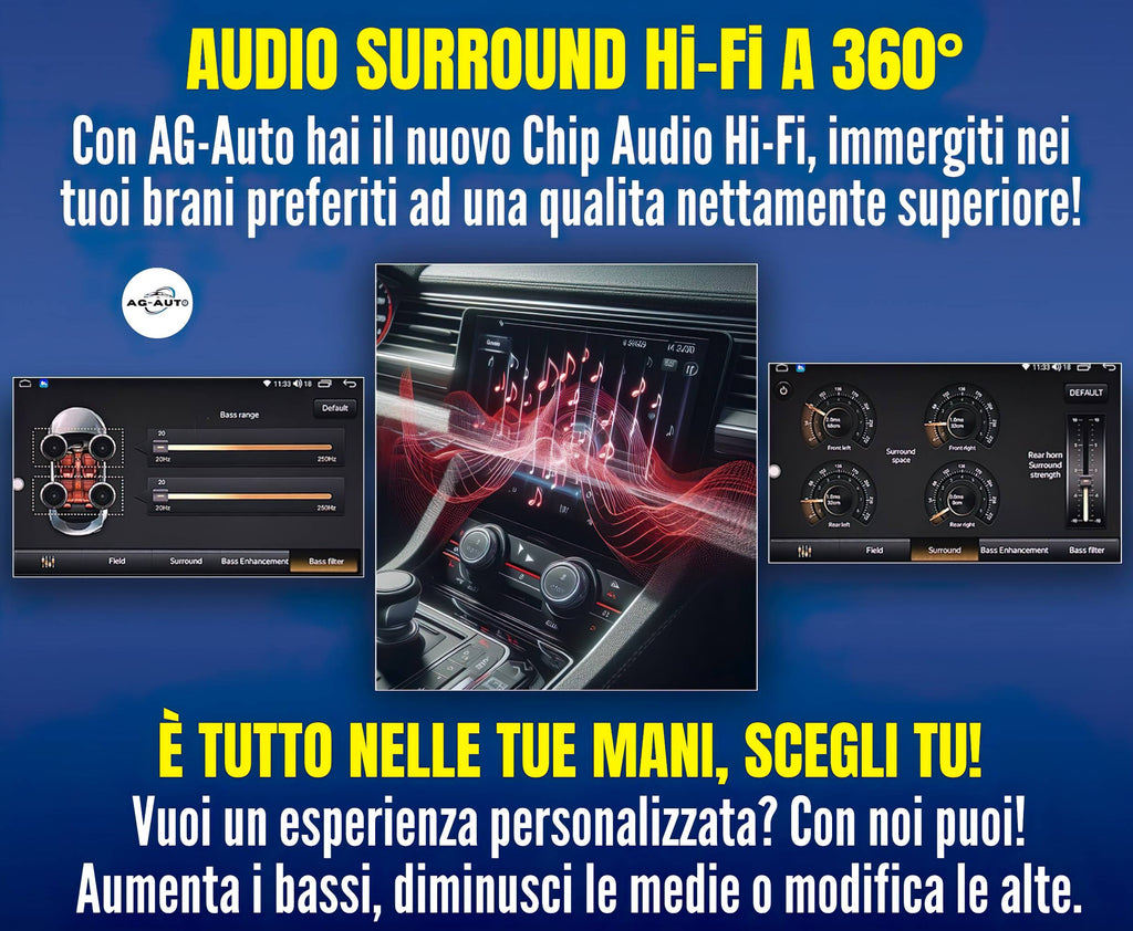 🔊 HiFi AG-Auto: EQ/DSP + amplificatore dedicato per un audio superiore + Uscite RCA con AUX e Subwoofer