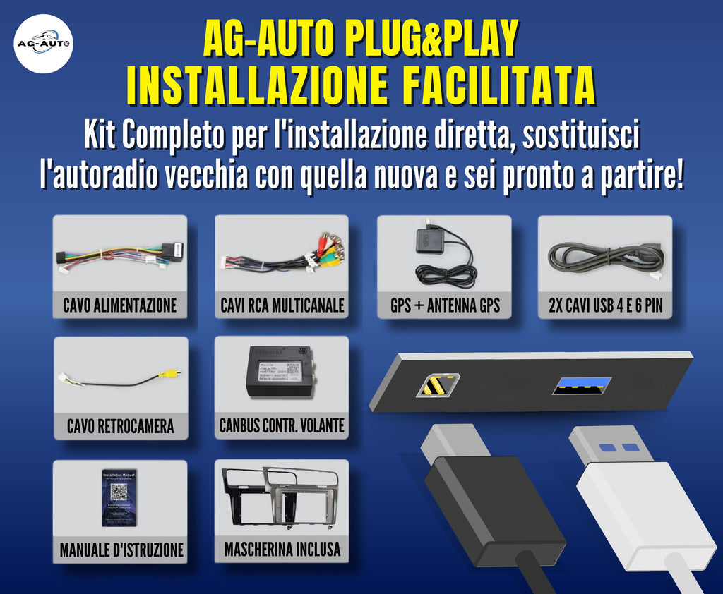 L'installazione avviene con il sistema plug&play AG-AUTO, che assicura un montaggio semplice come la radio originale, anche in autonomia. Tutti i cavi sono separati, etichettati e accompagnati da uno schema che aiuta l'installazione.
