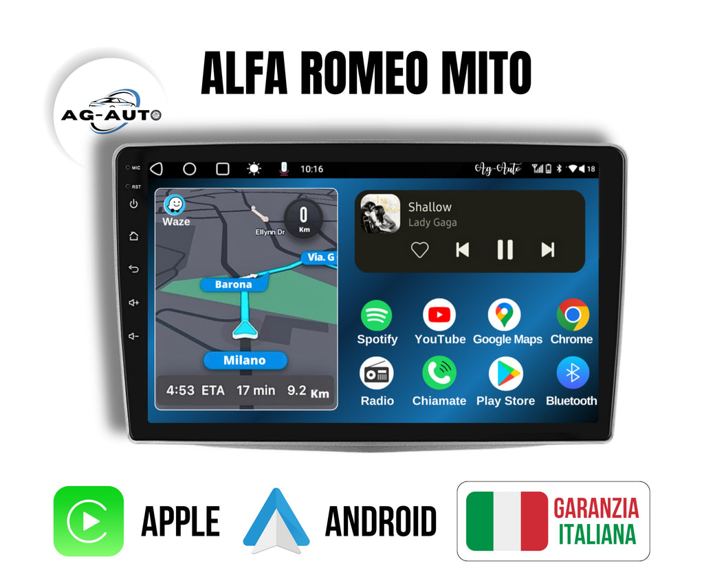 Alfa Romeo Mito (2008/2017) | 9 Pollici - Mascherina inclusa - Autoradio 2 Din Android auto + Carplay / Stereo Touch 2/32gb | Navigatore GPS + Bluetooth + Wifi