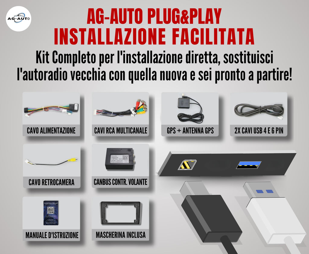 L'installazione avviene con il sistema plug&play AG-AUTO, che assicura un montaggio semplice come la radio originale, anche in autonomia. Tutti i cavi sono separati, etichettati e accompagnati da uno schema che aiuta l'installazione.