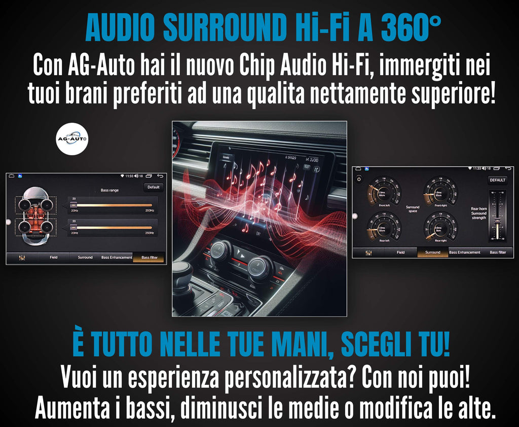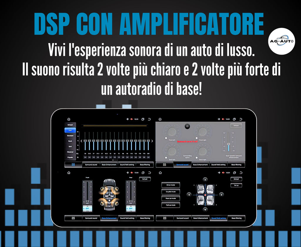 🔊 HiFi AG-Auto: EQ/DSP + amplificatore dedicato per un audio superiore + Uscite RCA con AUX e Subwoofer