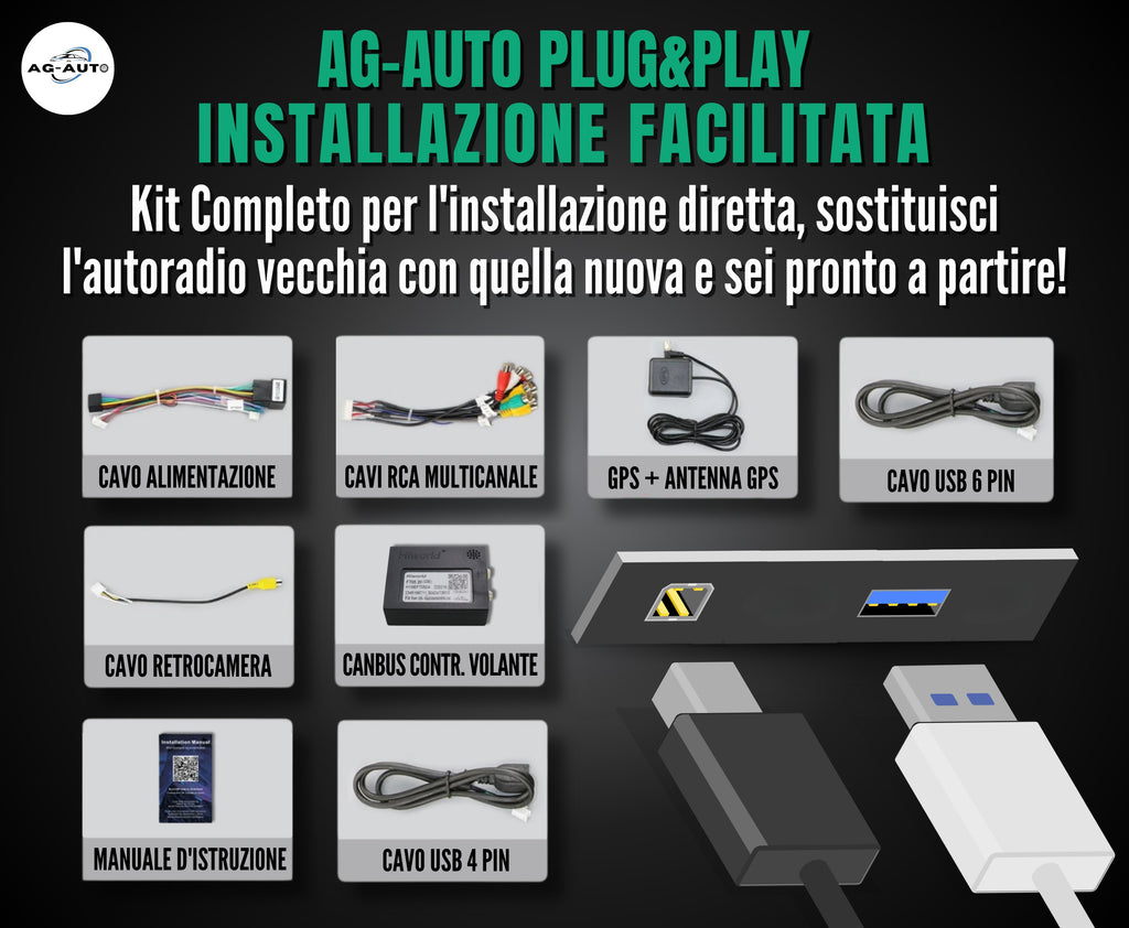 L'installazione avviene con il sistema plug&play AG-AUTO, che assicura un montaggio semplice come la radio originale, anche in autonomia. Tutti i cavi sono separati, etichettati e accompagnati da uno schema che aiuta l'installazione.