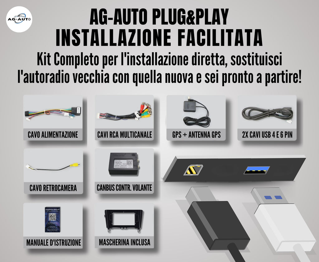 L'installazione avviene con il sistema plug&play AG-AUTO, che assicura un montaggio semplice come la radio originale, anche in autonomia. Tutti i cavi sono separati, etichettati e accompagnati da uno schema che aiuta l'installazione.