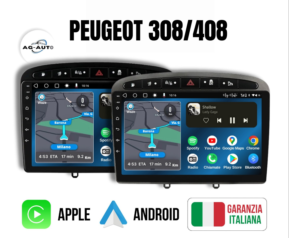 Peugeot 308/308s/408 (2012/2020) | 9 pollici Autoradio 2 Din Android auto + Carplay / Stereo Touch | Navigatore GPS + Bluetooth + Wifi + 2 prese USB + Aux
