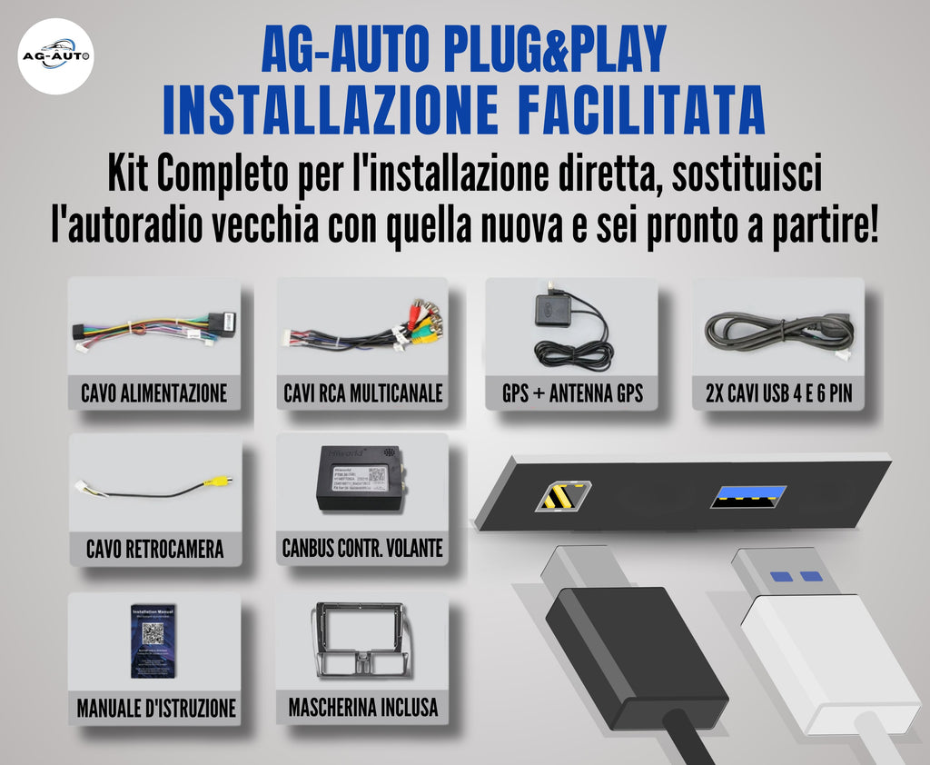 L'installazione avviene con il sistema plug&play AG-AUTO, che assicura un montaggio semplice come la radio originale, anche in autonomia. Tutti i cavi sono separati, etichettati e accompagnati da uno schema che aiuta l'installazione.
